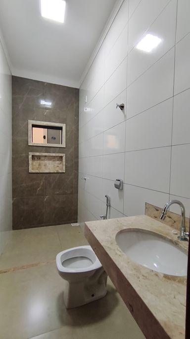 Ambientes amplos, sala grande e cozinha espaçosa. Acabamento em porcelanato, lavanderia funcional e ótima área construída em terreno de 162 m².