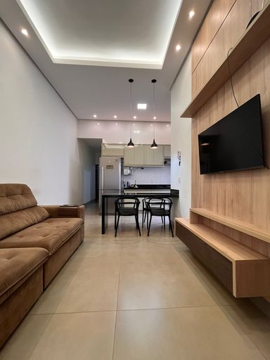 Ambientes integrados, ar-condicionado, churrasqueira na varanda, cozinha americana, lavanderia, móveis planejados, porcelanato