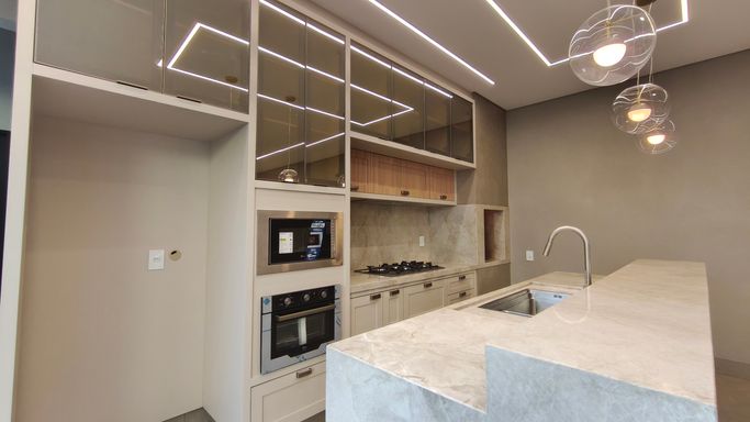 • Amplo espaço interno com porcelanato, móveis planejados e janela panorâmica.