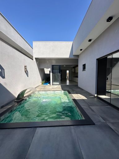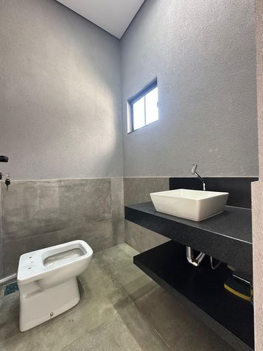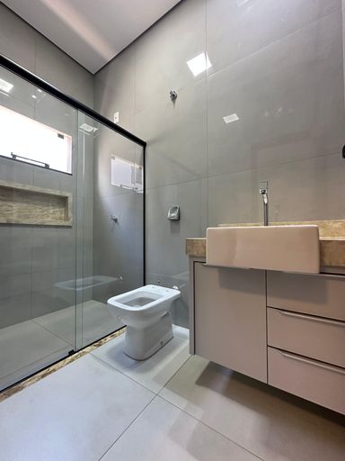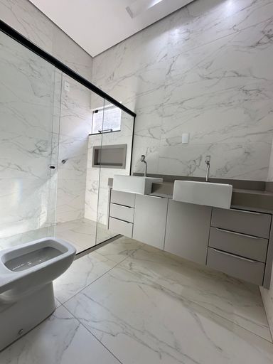 Detalhes no teto com sanca de gesso e iluminação em led;Suíte 01- Cuba dupla Off White embutida na pedra de cilestone cinza, box com moldura de alumino preto, porcelanato na parede e no piso imitando pedra natural, nicho de cilestone para produtos higiênicos;Suíte 02- Cuba Off White embutida na pedra de mármore, box com moldura de alumínio, revestimento porcelanato e nicho de mármore para produtos higiênicos; Suíte 03- Cuba embutida na pedra de mármore, box com moldura de alumínio, nicho para produtos higiênicos, revestimento nas paredes de porcelanato cinza;Área externa com piscina aquecida, que contem uma cascata, iluminação na parede de trás, ducha ao lado, spots com iluminação led nas paredes, corredor largo que da acesso para o lado de fora da casa;Lavabo na parte exterior, com cuba sobreposta no granito preto, prateleira de pedra abaixo da bancada da pia, revestimento em 1/4 da parede no porcelanato;Lavanderia com pia dupla embutida no granito preto, revestimento na cerâmica, pintura no tom de cimento e com espaço para maquina e tanque;Agende sua visita!